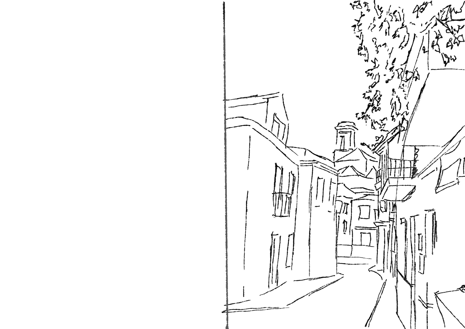 Die Zeichnungen, die sie hier sehen, wurden dafür auf drei, auf der Bühne verteilten, Vorhänge projiziert, um zum einen einen schlichten, weißen Bühnenraum zu ermöglichen und dem Raum zum anderen dennoch eine gewisse Tiefe geben.
